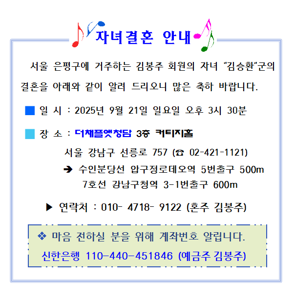 (결혼) 김봉주 회원 자녀 결혼 안내