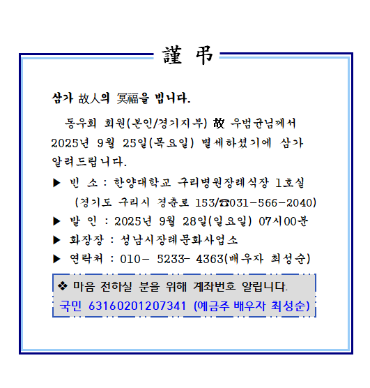 (부고) 우범균 회원 본인(경기지부) 별세 알림