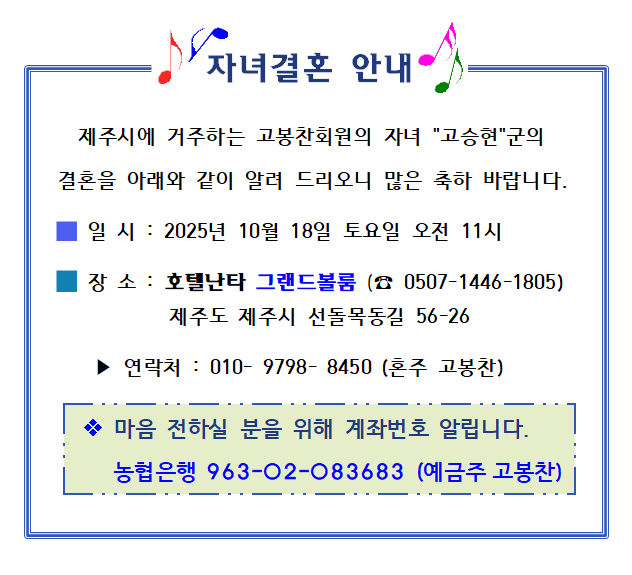 (결혼) 고봉찬 회원 자녀 결혼 안내